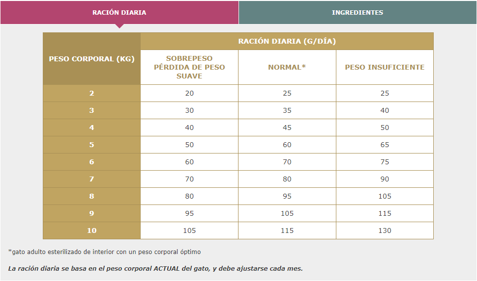 -Control del peso corporal. La concentración de energía moderada de la dieta y las raciones diarias adaptadas ayudan a mantener un peso corporal óptimo.