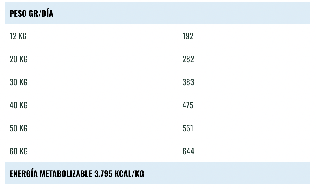 Proteína bruta 26,00%, Grasa bruta 15,00%, Fibra bruta 2,50%, Ceniza bruta 7,90%, Calcio 1,60%, Fósforo 0,95%, Humedad 9,00%, EPA+DHA 0,56%, Glucosamina clorhidrato 380mg/kg, Condroitín sulfato 240mg/kg