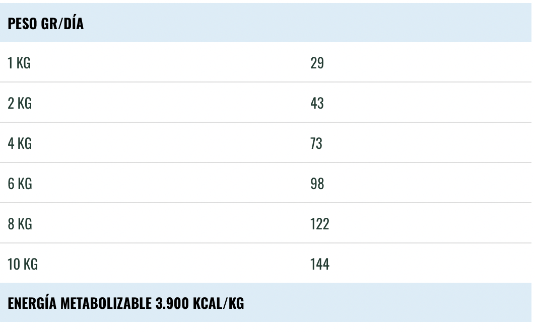 Aditivos nutricionales: Vitamina A 22.000 U.I/kg.,Vitamina D-3 1.600 U.I/kg.,Vitamina E 460 mg/kg., Vitamina C 200 mg/kg., Biotina 2.000 mcg/kg., L-Carnitina 60 mg/kg, Cloruro de colina 1.800 mg/kg., Taurina 1.200 mg/Kg., Hierro (Sulfato ferroso monohidratado) 60 mg/kg., Hierro (Quelato ferroso de hidrato de glicina) 12 mg/kg, Cobre (Sulfato cúprico pentahidratado) 5,5 mg/kg., Cobre (Quelato cúprico de hidrato de glicina) 3,4 mg/kg., Manganeso (Sulfato manganoso monohidratado) 38 mg/kg., Manganeso (Quelato de manganeso de hidrato de glicina) 12 mg/kg., Zinc (Sulfato de zinc monohidratado) 76 mg/kg., Zinc (Quelato de zinc de hidrato de glicina) 46 mg/kg., Iodo (Yoduro de potasio) 2 mg/kg., Selenio (Selenito de sodio) 0,11 mg/kg., Selenio (Análogo hidroxilado de la selenometionina) 0,11 mg/kg.