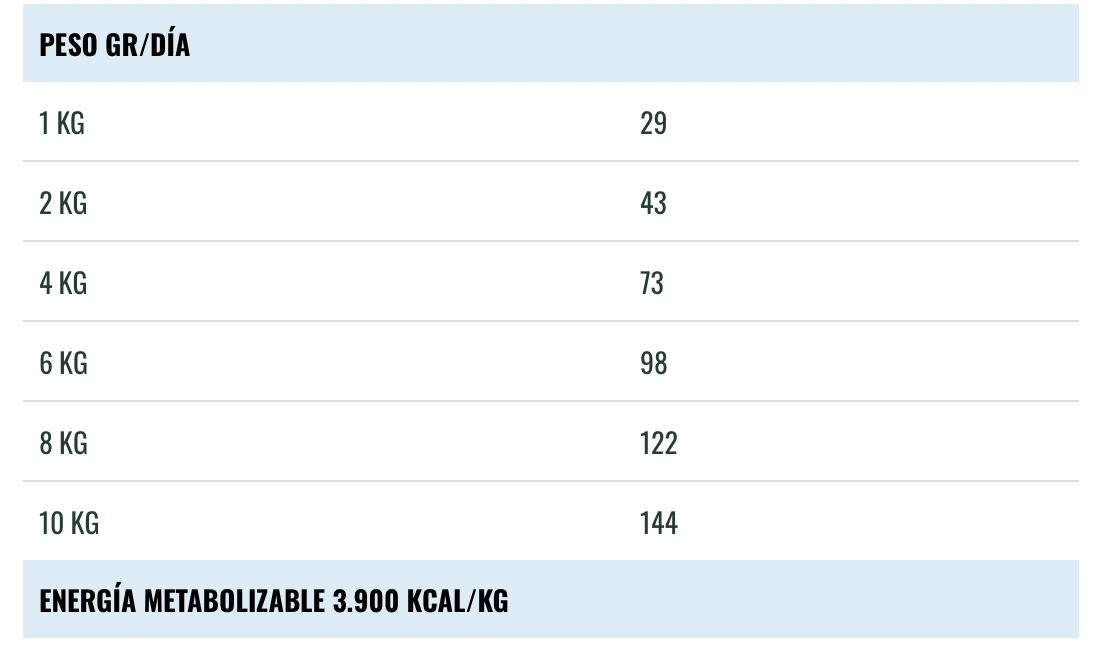 Aditivos nutricionales: Vitamina A 22.000 U.I/kg.,Vitamina D-3 1.600 U.I/kg.,Vitamina E 460 mg/kg., Vitamina C 200 mg/kg., Biotina 2.000 mcg/kg., L-Carnitina 60 mg/kg, Cloruro de colina 1.800 mg/kg., Taurina 1.200 mg/Kg., Hierro (Sulfato ferroso monohidratado) 60 mg/kg., Hierro (Quelato ferroso de hidrato de glicina) 12 mg/kg, Cobre (Sulfato cúprico pentahidratado) 5,5 mg/kg., Cobre (Quelato cúprico de hidrato de glicina) 3,4 mg/kg., Manganeso (Sulfato manganoso monohidratado) 38 mg/kg., Manganeso (Quelato de manganeso de hidrato de glicina) 12 mg/kg., Zinc (Sulfato de zinc monohidratado) 76 mg/kg., Zinc (Quelato de zinc de hidrato de glicina) 46 mg/kg., Iodo (Yoduro de potasio) 2 mg/kg., Selenio (Selenito de sodio) 0,11 mg/kg., Selenio (Análogo hidroxilado de la selenometionina) 0,11 mg/kg.
