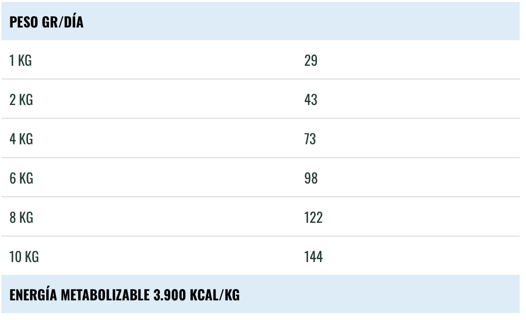 Aditivos nutricionales: Vitamina A 22.000 U.I/kg.,Vitamina D-3 1.600 U.I/kg.,Vitamina E 460 mg/kg., Vitamina C 200 mg/kg., Biotina 2.000 mcg/kg., L-Carnitina 60 mg/kg, Cloruro de colina 1.800 mg/kg., Taurina 1.200 mg/Kg., Hierro (Sulfato ferroso monohidratado) 60 mg/kg., Hierro (Quelato ferroso de hidrato de glicina) 12 mg/kg, Cobre (Sulfato cúprico pentahidratado) 5,5 mg/kg., Cobre (Quelato cúprico de hidrato de glicina) 3,4 mg/kg., Manganeso (Sulfato manganoso monohidratado) 38 mg/kg., Manganeso (Quelato de manganeso de hidrato de glicina) 12 mg/kg., Zinc (Sulfato de zinc monohidratado) 76 mg/kg., Zinc (Quelato de zinc de hidrato de glicina) 46 mg/kg., Iodo (Yoduro de potasio) 2 mg/kg., Selenio (Selenito de sodio) 0,11 mg/kg., Selenio (Análogo hidroxilado de la selenometionina) 0,11 mg/kg.