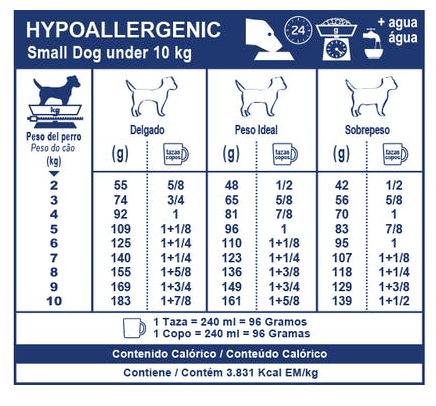 Arroz, hidrolizado de extracto proteico de soja, sales minerales, aceite de pollo, grasa vacuna, hidrolizado de hígado de pollo y/o cerdo y/o vacuno, aceite de soja, zeolita, pulpa de remolacha, aceite de pescado, fructo-oligosacáridos (FOS), vitaminas, oligoelementos, oligoelementos quelados, DL-metionina, taurina, aceite de borraja, extracto de rosa de la India (rico en luteína), tirosina, oligoelementos quelados. Vitaminas: Vitamina A, vitamina D3, vitamina E, vitamina C, pantotenato de calcio, niacina, vitamina B1, vitamina B2, vitamina B6, ácido fólico, biotina, vitamina B12, colina. Sales minerales: Fosfato monocálcico, cloruro de sodio, sulfato de calcio, cloruro de potasio, sorbato de potasio, calcita. Oligoelementos: Politrifosfato de sodio, sulfato de cobre, sulfato de hierro, óxido de manganeso, óxido de magnesio, óxido de zinc, iodato de calcio, selenio orgánico. Oligoelementos quelados: Cobre, manganeso, zinc. Conservantes y Antioxidantes: BHA, galato de propilo y ácido cítrico.