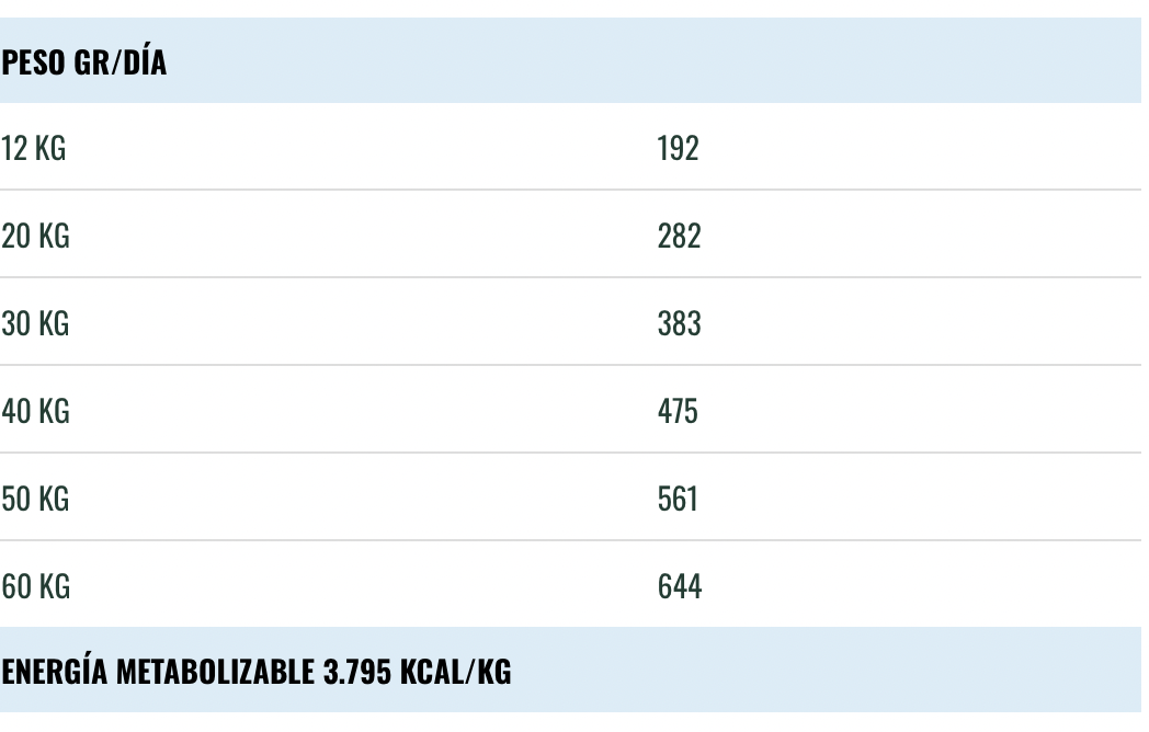 Proteína bruta 31,00 %, Grasa bruta 20,00 %, Fibra bruta 2,40 %, Ceniza bruta 7,80 %, Calcio 1,40 %, Fósforo 0,95 %, Humedad 9,00 %, EPA+DHA 0,63%, Glucosamina clorhidrato 380 mg/kg, Condroitín sulfato 240 mg/kg