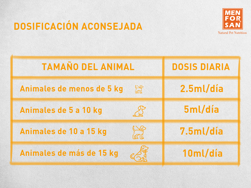 | Animales de menos de 5 Kg | 2,5 ml / dia |